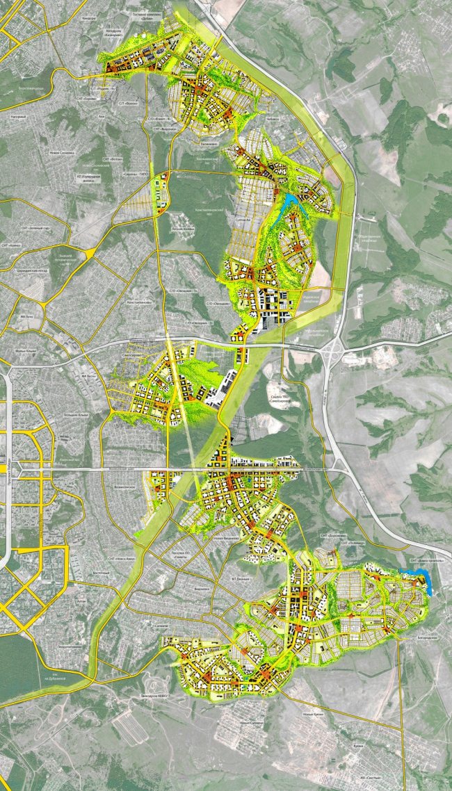 Одна из ключевых идей нашей концепции – создание «ожерелья» мини-городов, которые обладают не только функциональной насыщенностью и специализацией, но и пространственно-средовой полноценностью. В каждом мини-городе есть свое главное место и достаточное разнообразие публичных пространств: площади, скверы, бульвары, торговые улицы. Этот подход близок к тому, который мы пытались реализовать в поселении Вороновское.