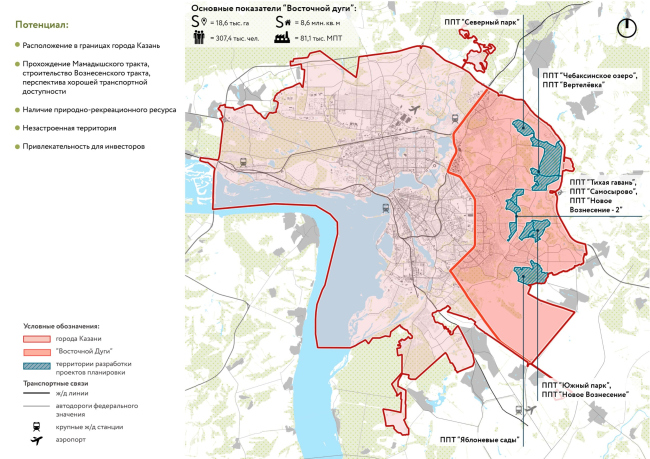 «Восточная дуга» – один из главных земельных резервов развития Казани, при этом сосредоточенный в руках одного владельца. Институт Генплана Москвы разработал концепцию комплексного освоения этой территории, основанную на аналитической транспортной модели, которая позволит создавать комфортную жилую среду, новые центры притяжения и рабочие места.