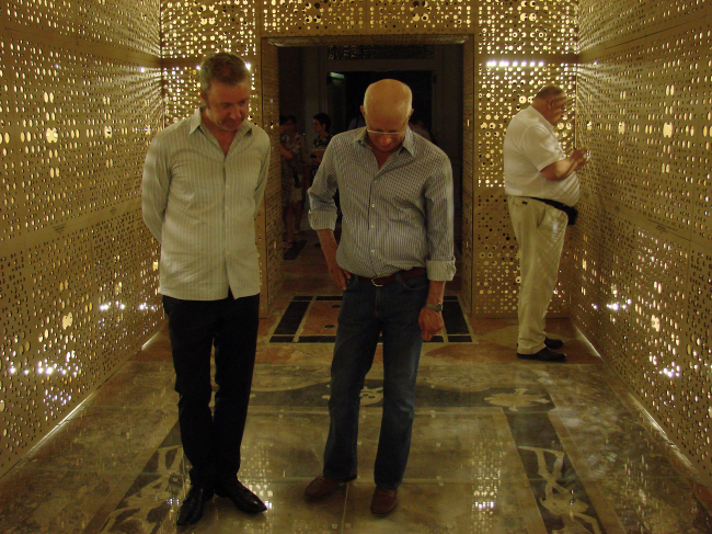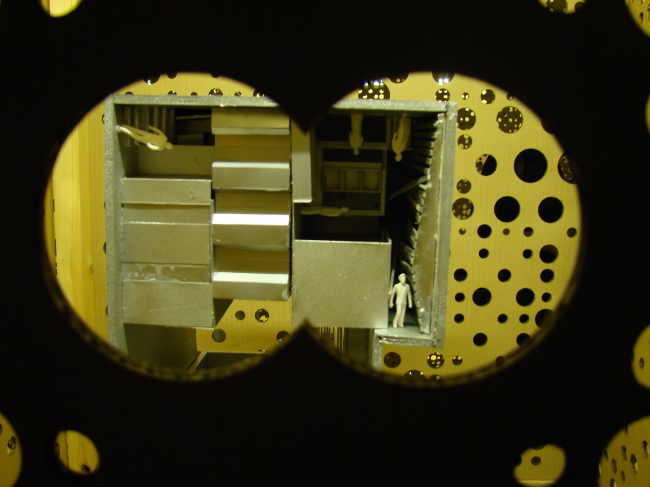 В принципе, распределение ролей в совместном творчестве есть внутреннее дело авторов, будь то Бродский-Уткин или Илья и Эмилия Кабаковы, но для интересующихся замечу, что в домике-вертепе использовано не только внешнее сходство с меганомовским сараем в Николо-Ленивце, но и внутреннее устройство ерофеевской выставки 1989 года "В Сторону объекта" в амстердамском Stedelijk музее, в которой я использовал мотив и форму ковчега для экспонирования 180 царицынских объектов. Зрители смотрели выставку сквозь многочисленные глазки и иллюминаторы, прорезанные в толстых листах гофрокартона, говорили, что получилось как в peep-show, всем нравилось, и никто не сетовал на потерю "персональной идентичности" выставленных объектов. Позже Ерофеев использовал тот же прием для "Запретного искусства", так что при желании меня можно записать в его подельники в нынешнем сахаровском судопроизводстве. В случае с ковчегом в церкви Сан-Стае, все глазки были парными, разведены, как в венецианских масках, на стандартное межцентровое расстояние, варьировались только радиусы отверстий - для желающего заглянуть внутрь картонной стены и разглядеть объект не возникало никаких проблем, я разговаривал с некоторыми зрителями, видевшими выставку впервые - они обсуждали экспонаты, сравнивали их друг с другом, что-то, как упоминаемый Ассом, "выключенный из экспозиции" объект Арт-Бля, предлагали купить для частных коллекций...