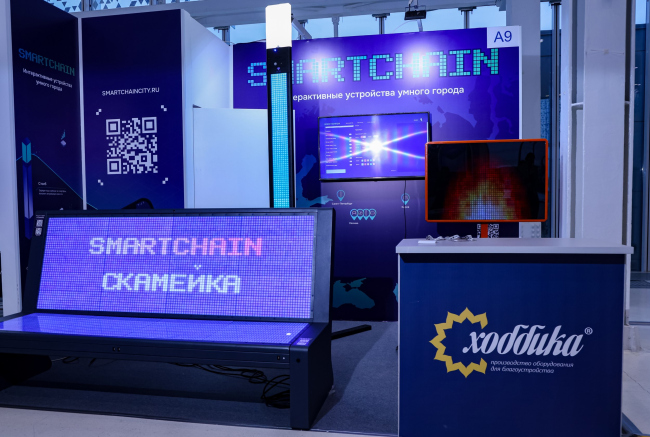 Компания «Хоббика» представит умные объекты для города – скамейку, урну для раздельного сбора мусора, столб и дорожный знак, а также малый и большой интерактивные экраны линейки Смартчейн.
