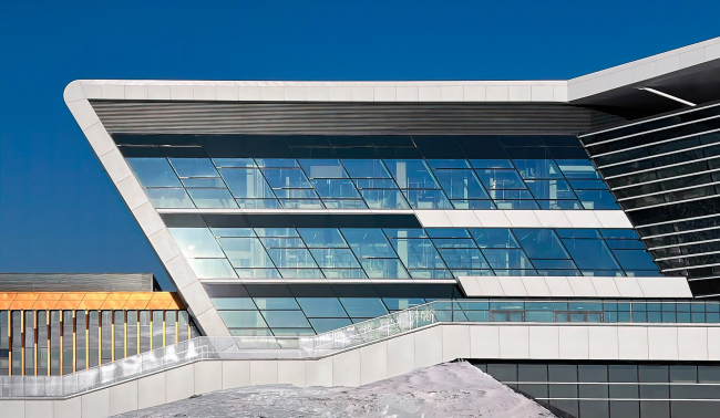 Архитектурно-образное решение раскрывает тему воды и волн. Основные объемы имеют большие остекленные поверхности. Несколько центральных фасадов выполнены с обратным уклоном, что придает композиции динамику. На глухих плоскостях использована треугольная матрица панелей с сеткой отверстий, образующих волнообразные рисунки. Такой прием сочетается с фасадными элементами, имеющими объемную пластику, выполненными из рельефных 3d-панелей медного цвета. Блики воды, морская пена, песок и камни – это цвета и фактуры, присутствующие в образе здания.