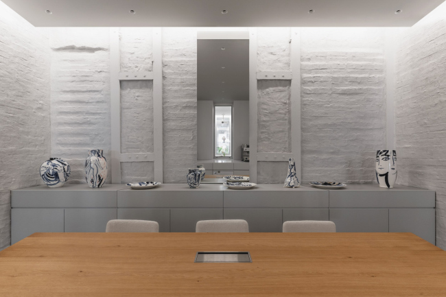 Планировка организована вокруг осей, ведущих от фасада в глубину помещения; их траектория подчеркнута положением потолочных светильников. Окна есть только на одной стороне офиса, но небольшая глубина пространства, светлая палитра с использованием отражающих материалов и зеркало на противоположной стене позволяют максимально использовать естественное освещение.