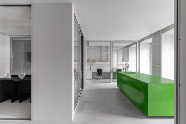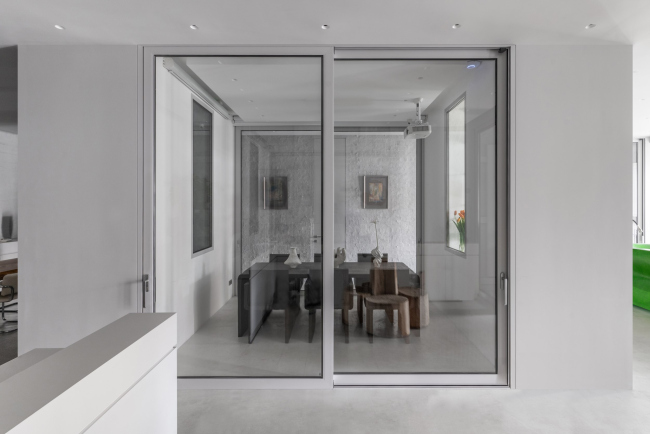Пространство состоит из перетекающих друг в друга объемов, которые дробятся на отдельные комнаты с помощью стеклянных или текстильных перегородок. Открытый план визуально увеличивает помещение, а стеклянные окна-двери создают возможность уединения, оставляя ощущение связности пространств.