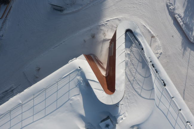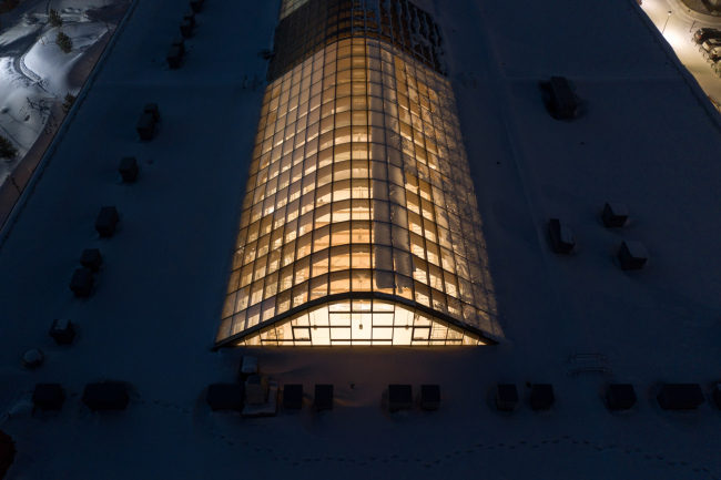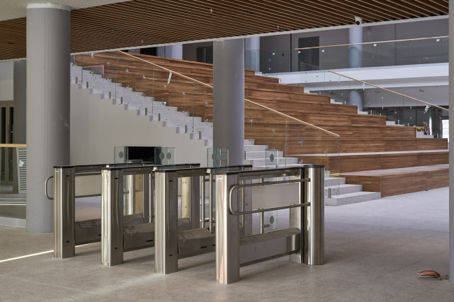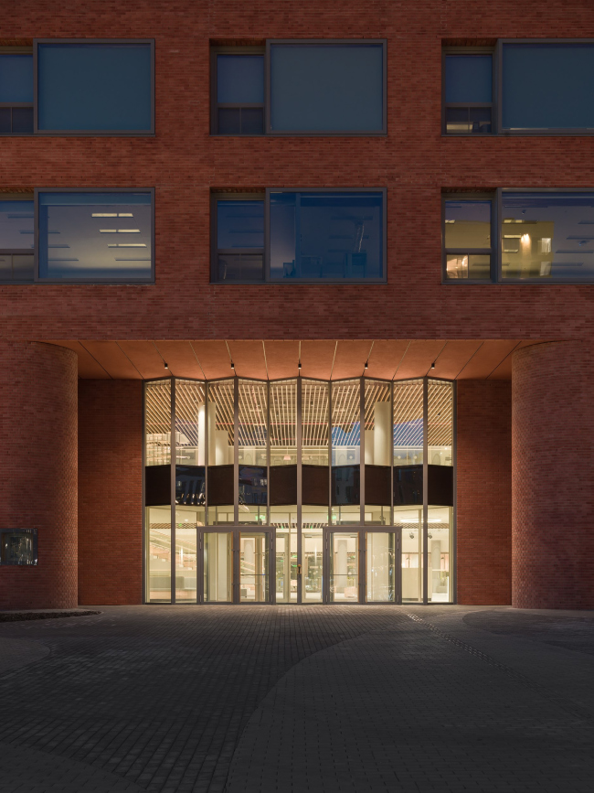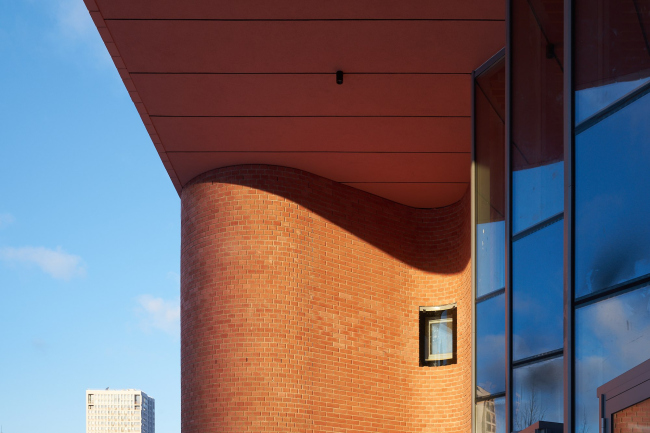 Плавность угловых акцентов эхом звучит в скругленных пилонах ниши главного входа, а также в арке зенитного фонаря. Благодаря тому, что инженерные коммуникации спрятаны в лотки и помещения на первом и последнем этажах, кровля играет роль пятого фасада. Складки лестничных стен выступают над ней, «указывая» на зенитный фонарь из гнутых деревянных балок и витражей.