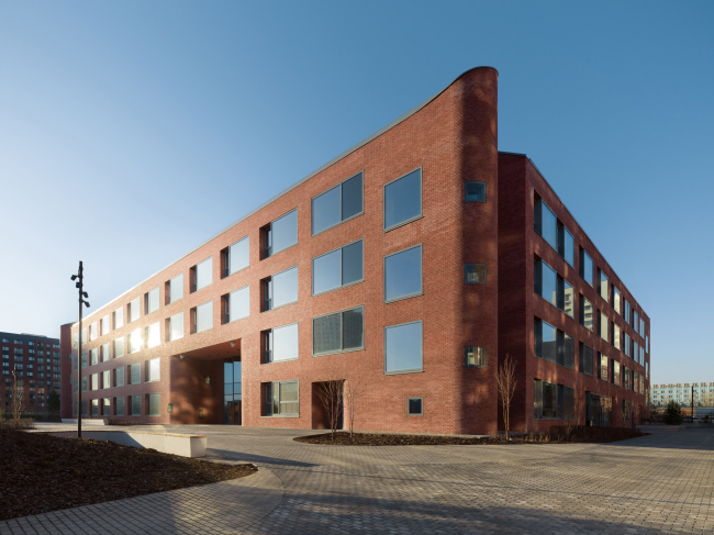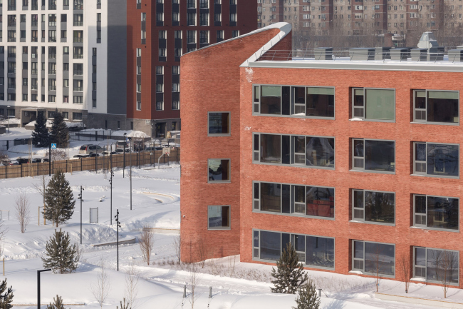 Школа располагается на открытом участке, на пересечении двух важных улиц, просматривается из многих точек «Евроберега». Поэтому все фасады, облицованные терракотовым клинкером, равнозначны и отличаются лишь входными группами и ритмическим рисунком больших окон: в классах установлены окна размером 2,5х4,5 метра, а в столовой и музыкальном классе – 14х3,2 и 10,6х3,2 метра. В темное время суток школа становится «маяком», излучая свет.