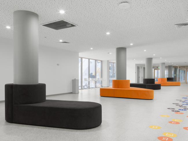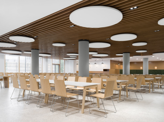 Медиакластер совмещает библиотеку, лабораторию, пресс-центр, коворкинг и книгохранилище. Учительская задумана как административный openspace из шести зон: открытого пространства для работы и отдыха педагогов, канцелярии, секретариата, переговорных, мини-кухни и рабочего места директора. Прозрачные перегородки добавляют работе преподавателей открытости. Спортивных залов два: малый примыкает к атриуму, большой выходит на северный фасад.