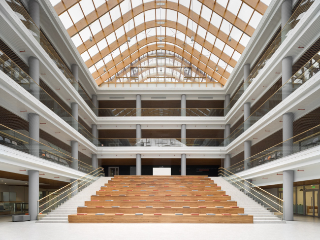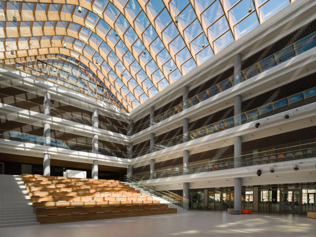 Школьная жизнь пульсирует в атриуме с амфитеатром. Большую часть времени он служит внутренней площадью, где можно встречаться, читать, играть и проводить перемены. Также он берет на себя функции актового зала, удобного для торжественных заседаний, кинопоказов, концертов и спектаклей. Зенитный фонарь на деревоклееном каркасе насыщает естественным светом атриум и галереи коридоров, из которых просматривается почти вся школа.