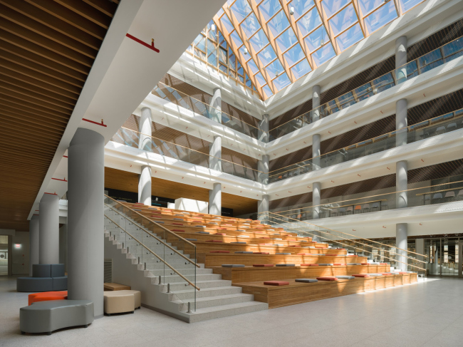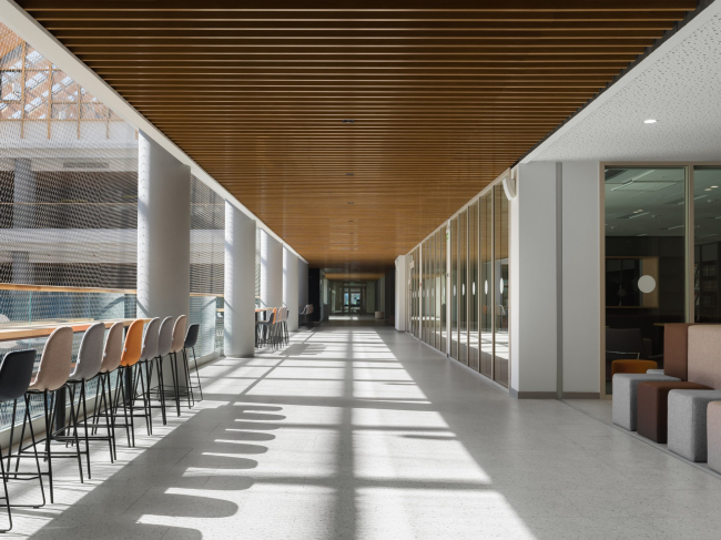 Классы-аудитории разного размера располагаются по внешнему контуру трех фасадов и одновременно вокруг внутреннего ядра атриума. На четвертую северную сторону выходят столовая и спортивный зал. От коридоров классы отделяют стеклянные перегородки, которые приоткрывают образовательный процесс и позволяют естественному свету пропитывать все здание насквозь.