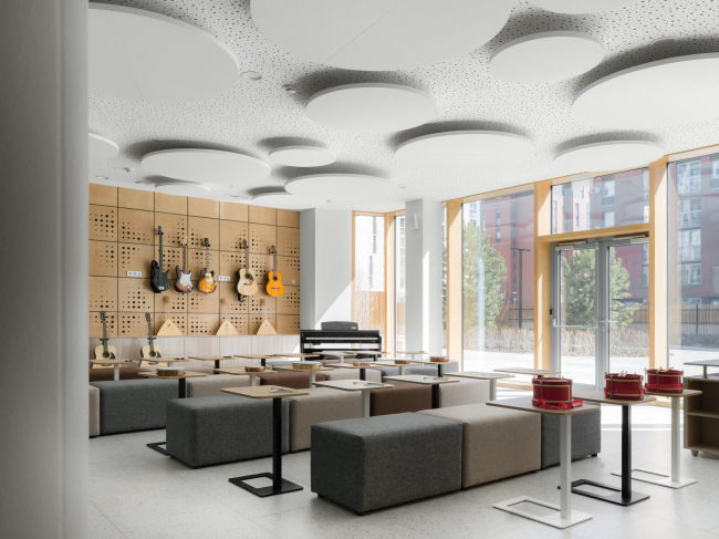 Специализированные классы заменили кластеры – медиа и арт, спортивный, естественно-научный и технологический. При этом все аудитории кросс-функциональны и могут использоваться для изучения нескольких предметов. Их габариты и конфигурация позволяют подстраиваться под разные методики образовательного процесса: мобильную мебель можно быстро переставить и подготовить класс для обычного урока, работы группах, дискуссии или неформальных занятий. Порядка десяти лабораторий и мастерских предназначены для творческих занятий и групп продленного дня.