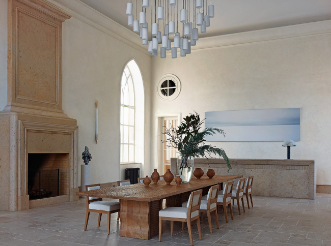 Дом площадью 800 м2 уже был построен, когда дизайнеры взялись за работу. Фасады решено было очистить от лишних декоративных деталей. Внутри провели перепланировку, поработали с цветом, уделили внимание тактильности (многие поверхности состарены или специально обработаны для появления сложного рельефа). Сердцем дома стала просторная гостиная-столовая с камином.