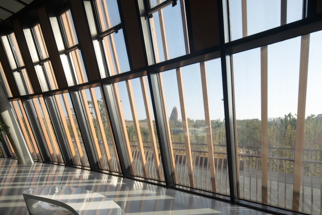 «Кольца» следуют за рельефом склонов, то поднимаясь над землей, то спускаясь ниже ее уровня. Их фасады оформлены ламелями из алюминия с напоминающей древесину текстурой: их вертикальный ритм должен напоминать о стволах растущего вокруг бамбука. Особое внимание было уделено проблеме кондиционирования: около 55% помещений получило естественную схему вентиляции, что сократило энергопотребление и углеродный след проекта.