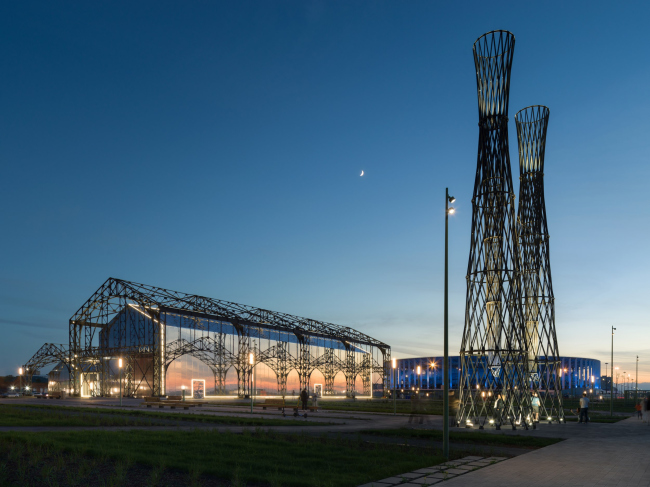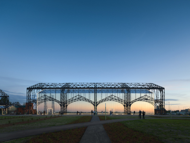 Кроме того, проект оригинален: кажется, конструкции исторических ангаров так еще ни разу показывали. Авторы, как мы помним, получили их уже без оболочки и со шлейфом восхищения от их кружевной красоты, отрывшейся после разборки стен. Не только сохранили, законсервировав во времени, но и удвоили ажурный рисунок – проект не просто эталонный, он еще и инновационный, все в нем сошлось (см. наш подробный очерк о проекте здесь).