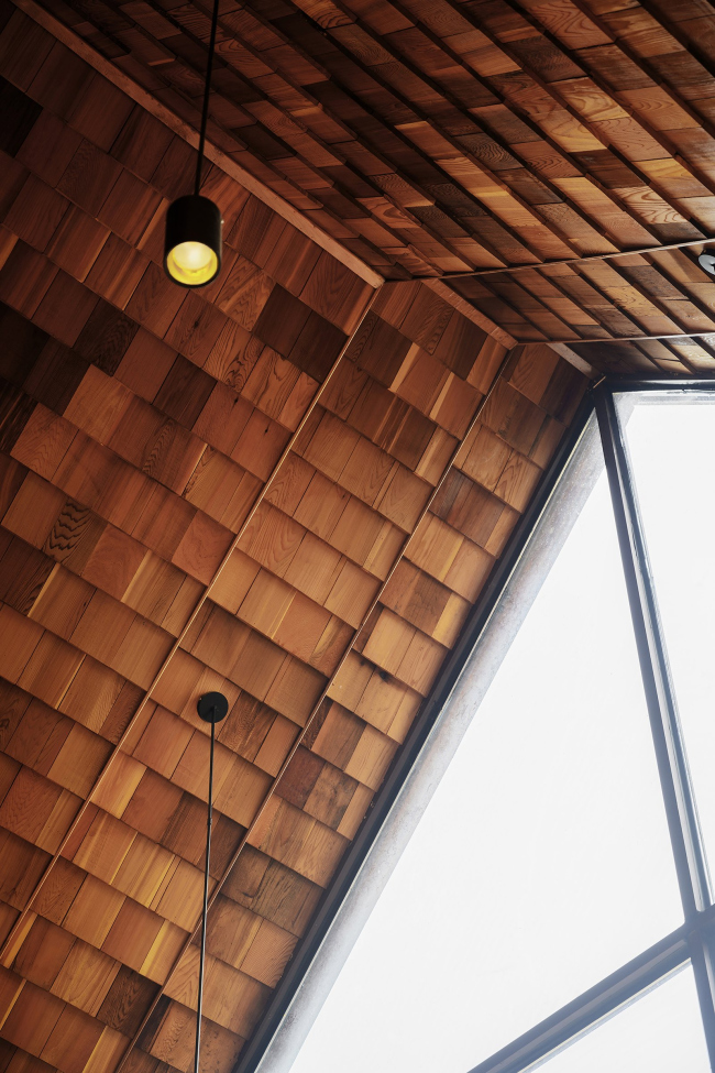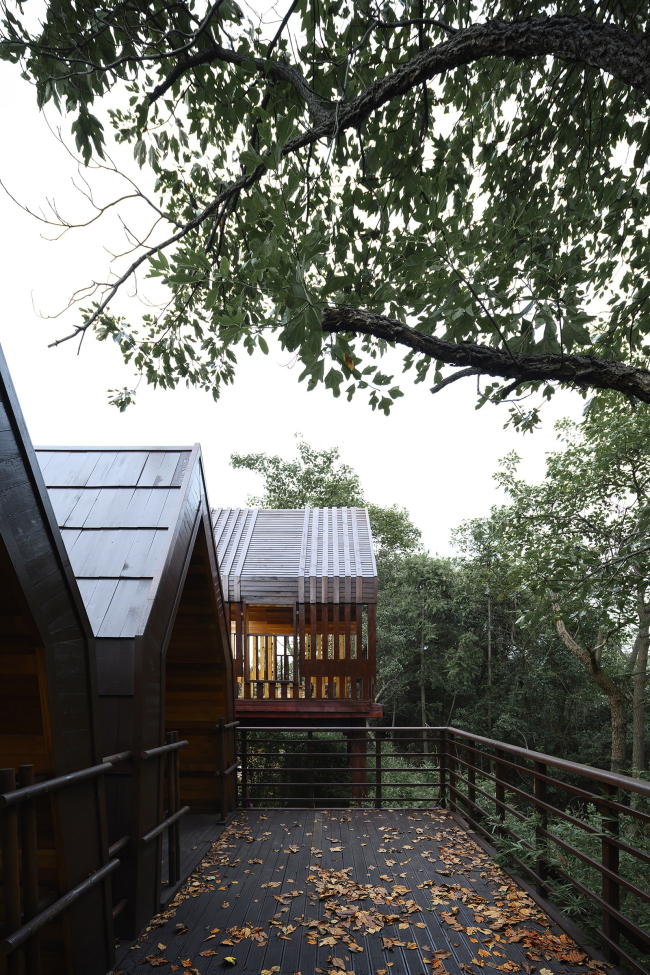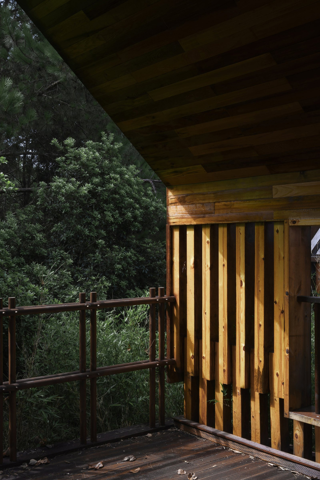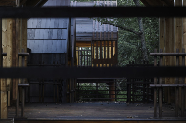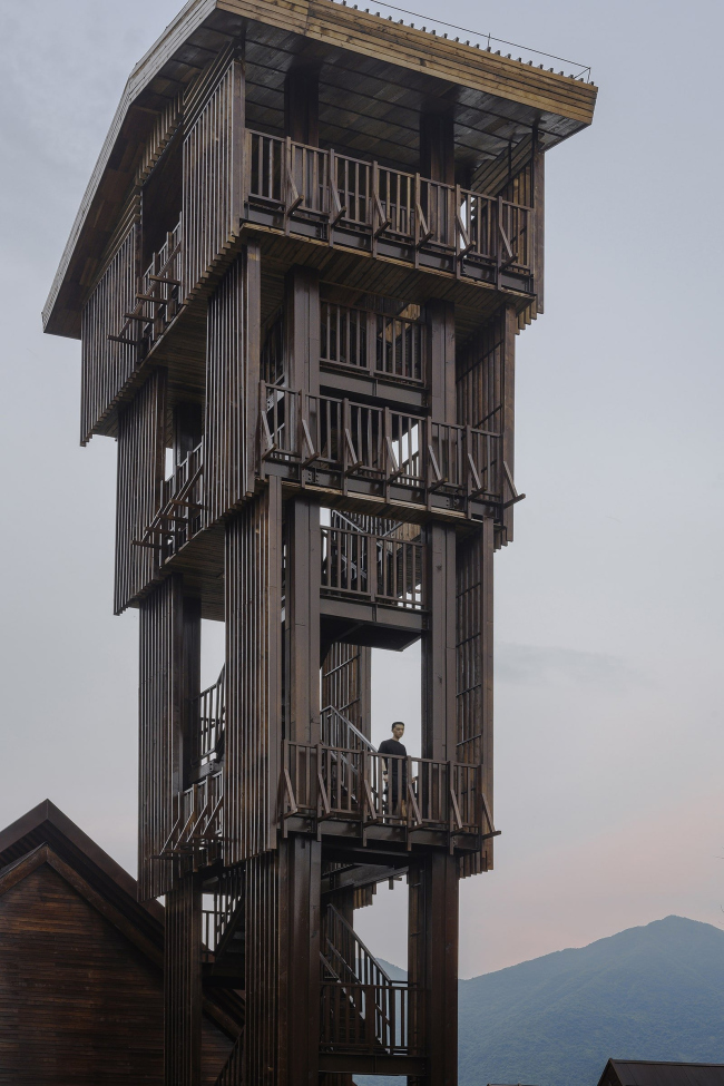 Смотровая башня единственная получила металлический каркас, но в остальном здесь тоже преобладает дерево: решетчатые экраны, благодаря которым она кажется то прозрачной, то монолитной в зависимости от точки зрения.