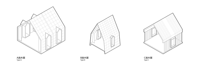 Использованы три типа домиков, которые в будущем можно еще более «диверсифицировать». Есть также полуоткрытый общественный «пустой» дом, сквозь который можно пройти, а можно остаться и отдохнуть. Многофункциональный зал с остекленными торцами по виду – двускатная кровля, дерево – представляет собой увеличенный вариант жилого домика. Внутренняя его поверхность перекрытий обшита гонтом. Озелененный двор со ступенями, которые могут играть роль зрительских мест, также подходит для проведения мероприятий.