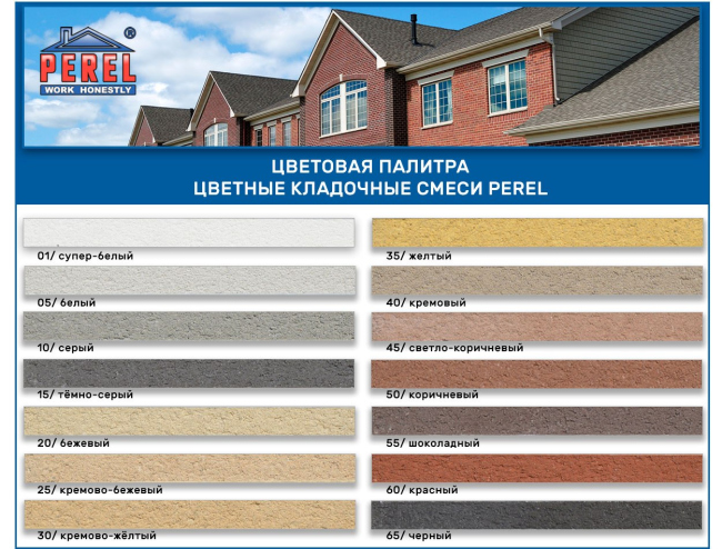 Какой же цвет кладки выбрать? Чтобы ответить на этот вопрос, возьмем за основу кладочные смеси марки Perel. Продукция этого бренда занимает лидирующие позиции на российском рынке по причине оптимального соотношения цены и качества. Самой популярной считается серая смесь, так как она считается универсальной. Если вам нужна , то стоит рассмотреть ТОП 5 цветов: