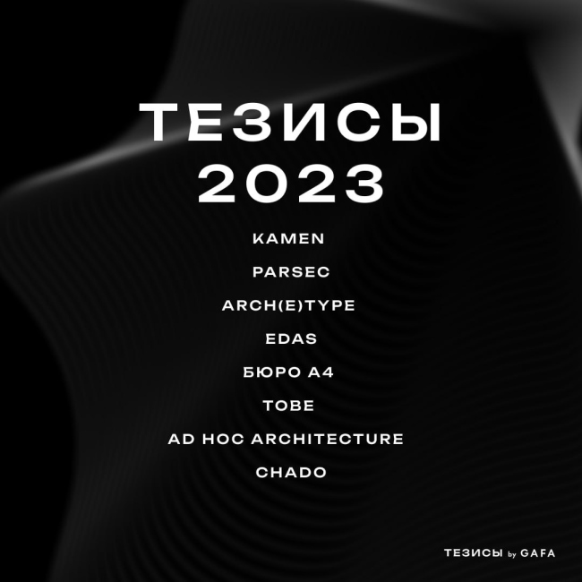Бюро GAFA курирует спецпроект «Тезисы», который развивает основную тему выставки. Здесь в формате архитектурный инсталляций будут представлены восемь высказываний о том, как построить лучшее будущее.