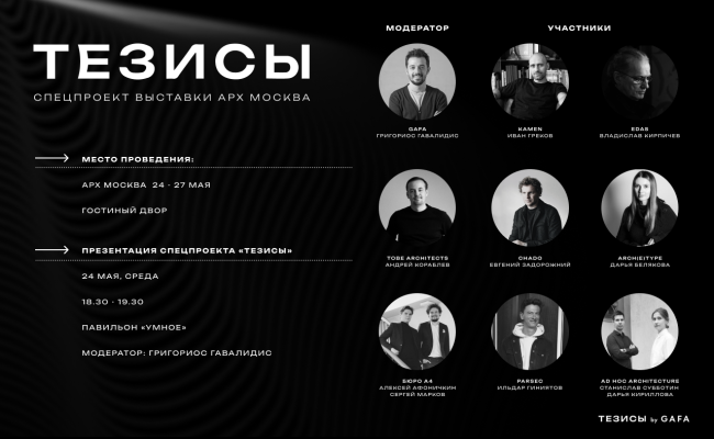По мере развития проекта GAFA получали разные предложения о сотрудничестве, но самой яркой для «Тезисов» стала коллаборация с – клубом и образовательной платформой, посвященной архитектуре и дизайну. Проект открылся в Москве совсем недавно, но уже аккумулирует множество интересных и значимых для архитектурного сообщества мероприятий. Дарья Белякова предложила «Тезисам» организовать в выставку для тех, кто не успел попасть на Арх Москву. Точные даты ее открытия скоро будут известны.