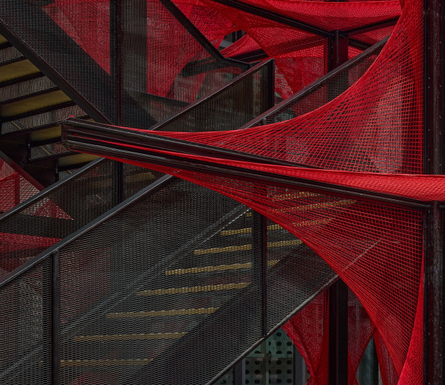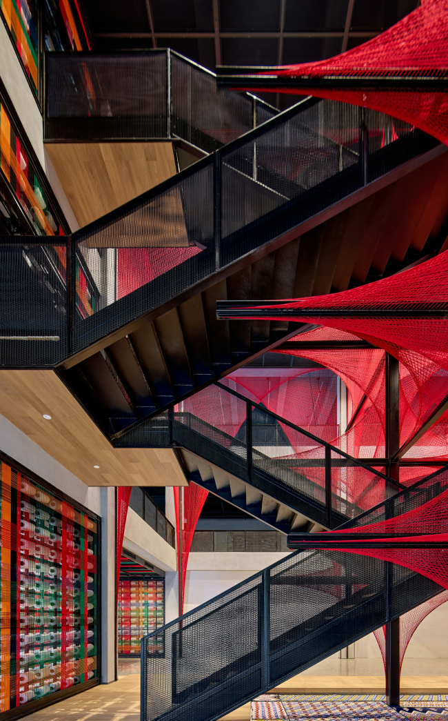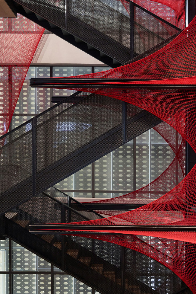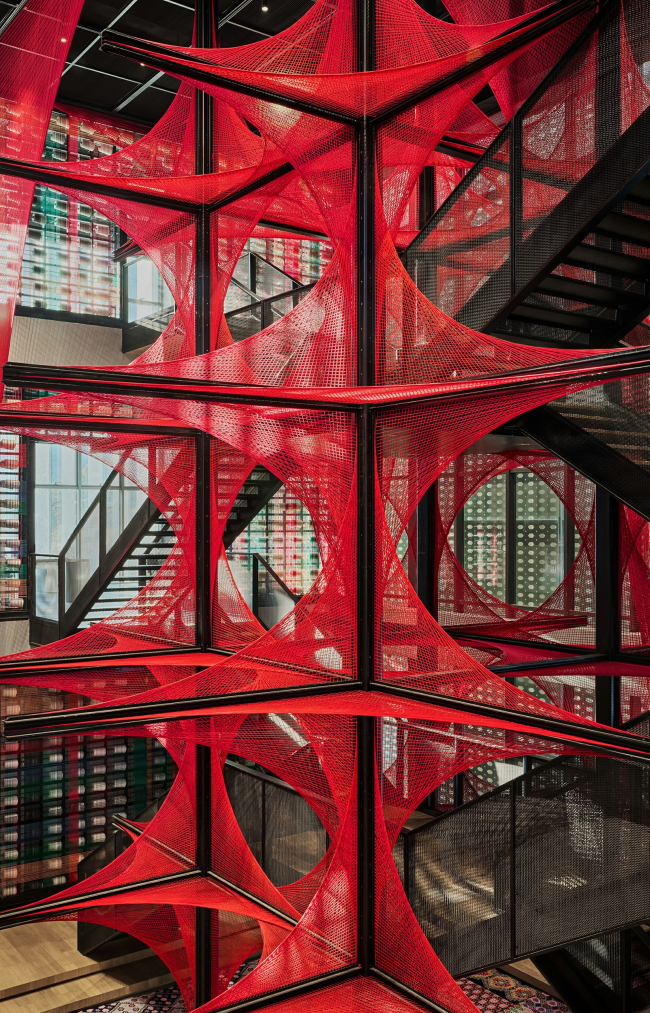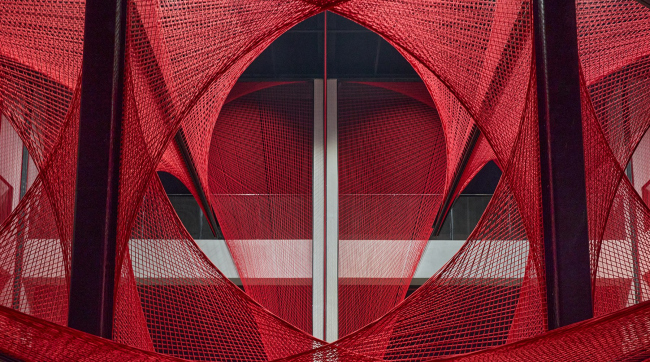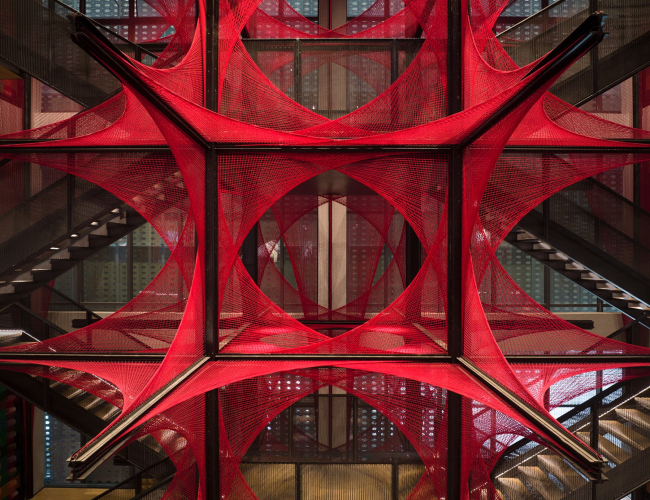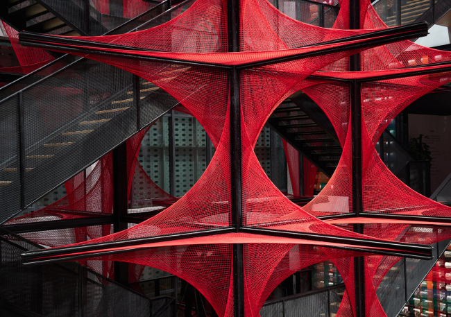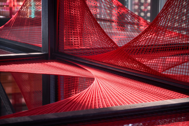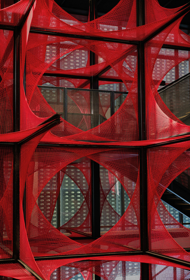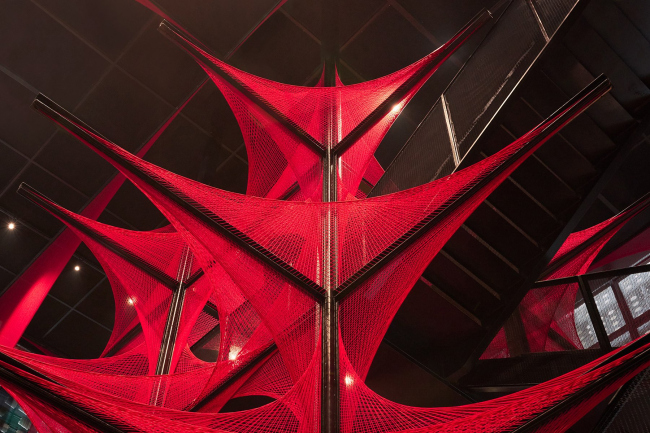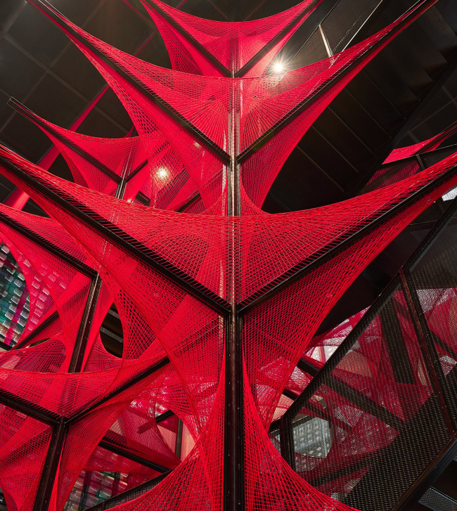 На производство «цветка» ушло около 150 000 метров шелковых тросов, каркасом для него служит стальная рама, состоящая из вертикальных опор и двутавровых балок. Ромбовидный рисунок, который можно наблюдать в переплетении отдельных элементов творения и очертаниях лестниц, вдохновлен традиционным для парчи туцзя узором.