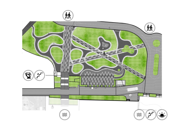 Продолжением парковой части стала мощеная площадь на вершине подпорной стенки, к которой ведет несколько волнообразных ступеней. Поскольку это пространство не защищено от солнца кронами деревьев, на ней сформировали смотровую площадку с удобными .