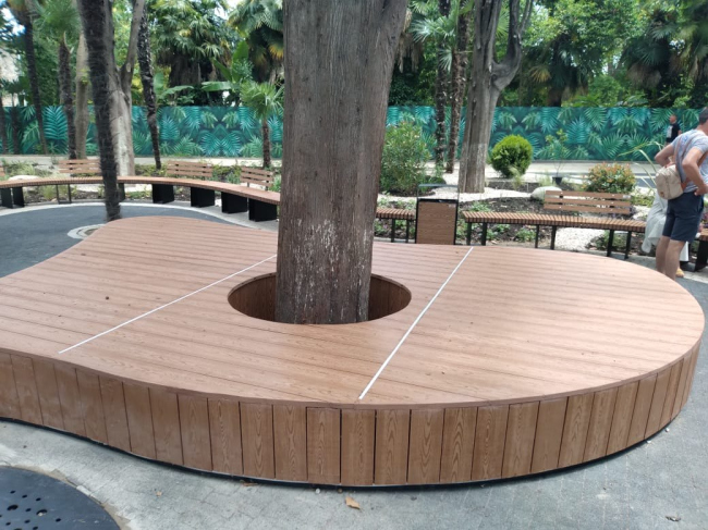 Еще одна разработка «Хоббики» – подиум криволинейной формы, установленный вокруг кипариса. Он создан по индивидуальному чертежу в соответствии с проектом и пожеланиями архитекторов. Его габариты составляют примерно 5х4 метра, – человеку удобно сидеть, но достать до дерева довольно сложно. Высота – 450 мм. В темное время суток подиум выделяет LED- подсветка.