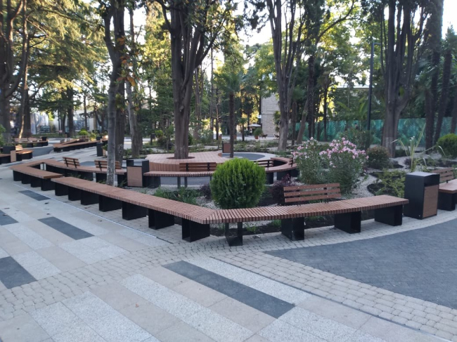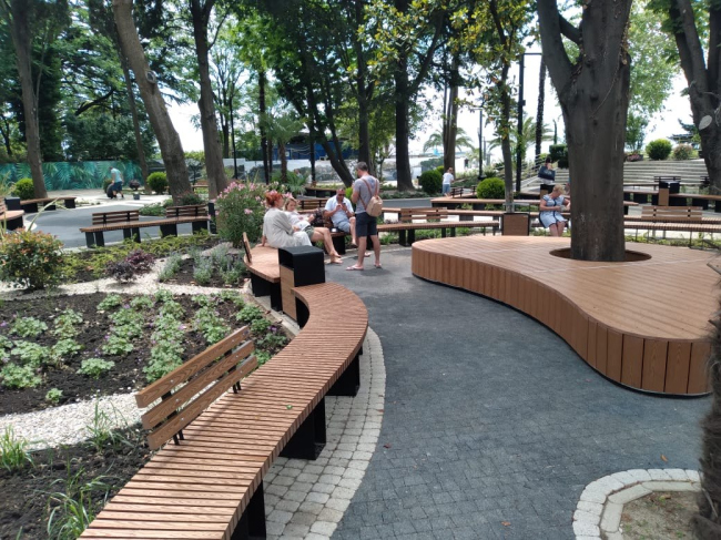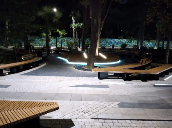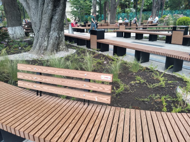 Для парковой зоны нового общественного пространства «Ривьера» в Сочи компания «Хоббика» сконструировала и изготовила больше 300 погонных метров скамеек, а также другие МАФы – лежаки, урны и подиум. Лаконичный дизайн подчеркивает красоту старых деревьев, а минерально-полимерный композит обещает долгий срок службы во влажном климате.