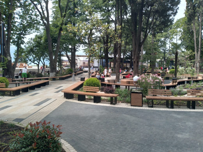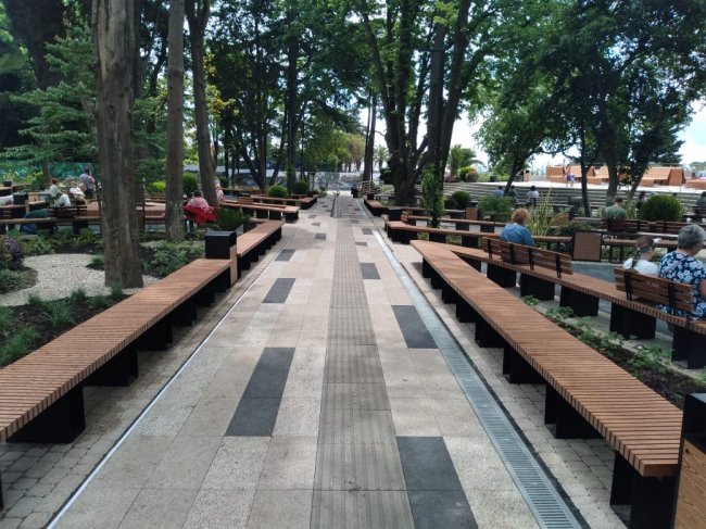 У посетителей, таким образом, появилось место для отдыха с разнообразными сценариями. Лежаки подходят для солнечных ванн и расслабленного приморского отдыха. На длинных скамейках всегда можно найти уединенное место, устроиться компанией, или присесть рядом с кем-то ради small talk или ощущения причастности к социуму.