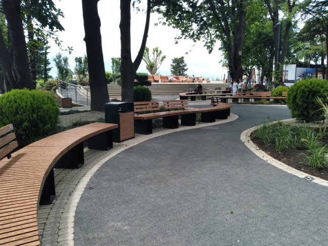 В результате малых архитектурных форм в парке оказалось не так уж мало, но они не подавляют природное окружение благодаря тому, что выполнены в едином лаконичном стиле и материалах с соответствующей цветовой гамме: черный металл и композит, имитирующий древесину, не отвлекают взгляд от зелени и моря на горизонте.
