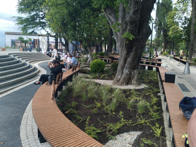До благоустройства верхний участок набережной «Ривьеры» представлял собой несколько диковатую рощу с вековыми каштанами, кипарисами и оливами. Красивые деревья, дающие густую тень и прохладу, стали главным «активом» места, который архитекторы постарались подчеркнуть.