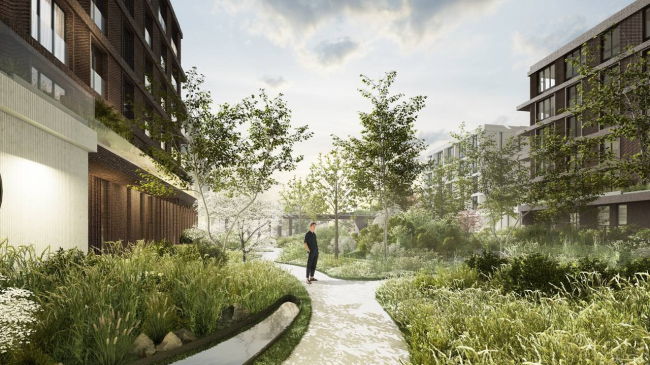 Отдельная гордость архитекторов – двор, он запланирован как обильно озелененный мини-парк, раскрытый, как мы помним, в сторону озера.