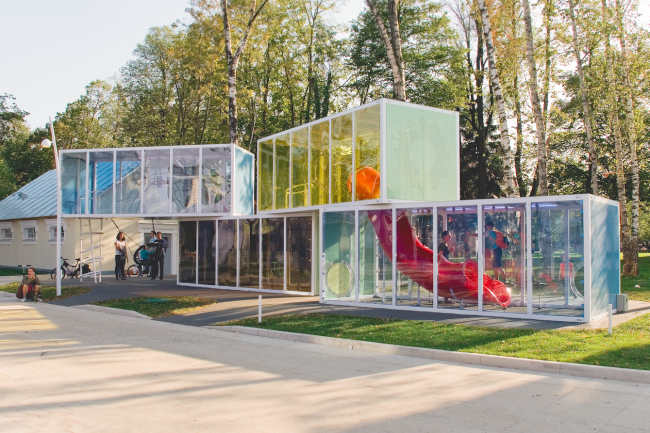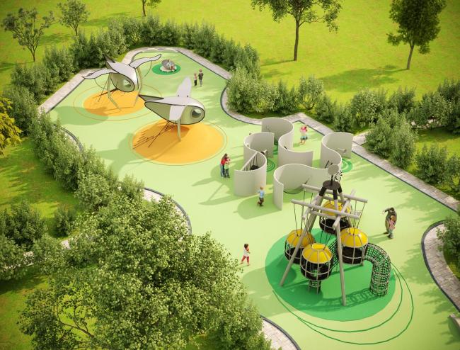 Малые архитектурные формы и игровые объекты насыщают площадку еще большим количеством функций и завершают образ города будущего, каким его представляли в прошлом веке.