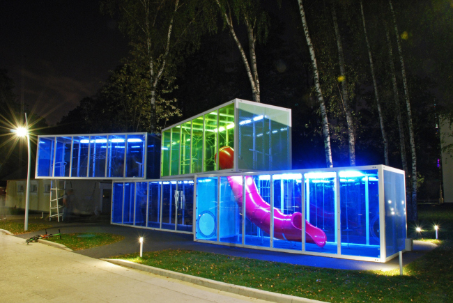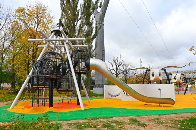 Центральный объект площадки – конструкция из стальных опор высотой около шести метров, к которой на армированных тросах на разном уровне подвешены четыре большие клетки. Они соединяются сетчатыми переходами: пробираясь по ним дети чувствуют себя почти как в веревочном парке, между стволами деревьев. Очертания клеток можно воспринимать и как каркас R2-D2 из «Звездных войн», и как отсеки космического корабля, соединенные герметичными переходами.