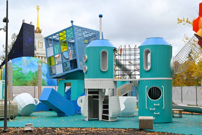Ретрофутуризм – не самый тривиальный для детских площадок стиль, однако дизайнеры компании «Новые горизонты» справились с этим вызовом: их, очевидно, вдохновили образы любимого многими мультфильма «Тайна третьей планеты» – к нему отсылает общая цветовая гамма, а в очертаниях узнаются некоторые .
