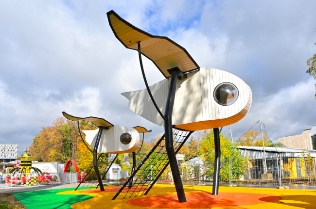 За лабиринтом парят птицы – два игровых домика, забраться в которые можно по широкой сетке. Внутри каждой птицы могут одновременно играть и наблюдать за происходящим через окна-глаза три ребенка. Стилизованные формы этих объектов взрослого заставят вспомнить знаменитую о том, что птиц на самом деле не существует, их давно заменили дронами. А детям дать представление о – имитации свойств и явлений природы с целью улучшения жизни человека.