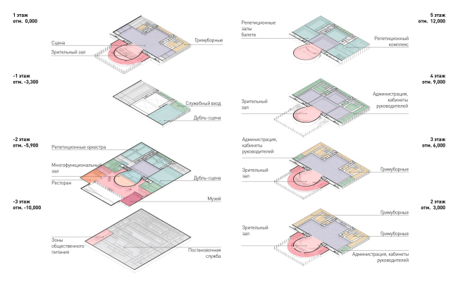 Главный зрительный зал: схема трансформаций. Концепция реконструкции Красноярского государственного театра оперы и балета им. Д.А. Хворостовского. Трансформация зала