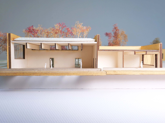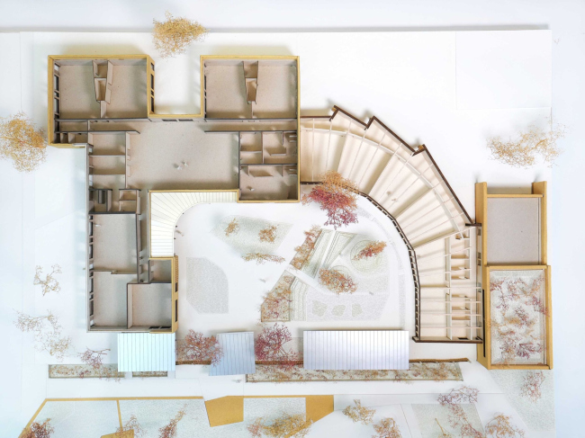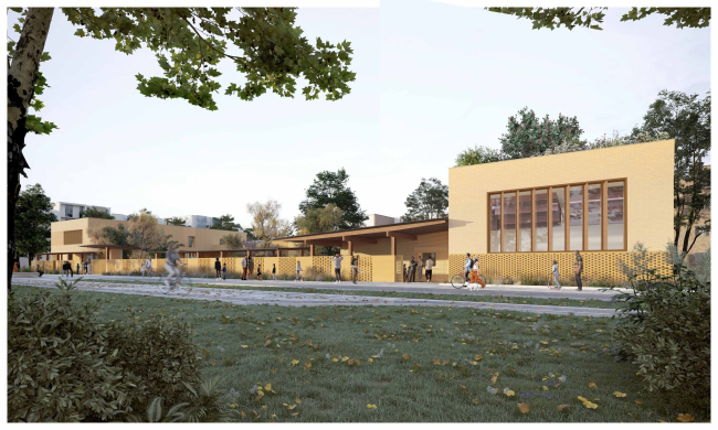 Постройка станет более проницаемой и «теплой», но одновременно ее лучше защитят от взглядов извне, в первую очередь – из окон окружающих жилых домов. Широкое использование светлого дерева и желтого кирпича, галерей, террас, остекления, устройство двора-сада должны сделать пребывание здесь комфортным детям и взрослым. Использование солнечных батарей, зеленой кровли и других «устойчивых» компонентов позволит старому-новому детскому саду вписаться в будущий «эко-квартал» по показателям ресурсоэффективности.Образовательный центр района Валибу© Graal Architecture