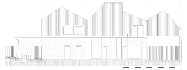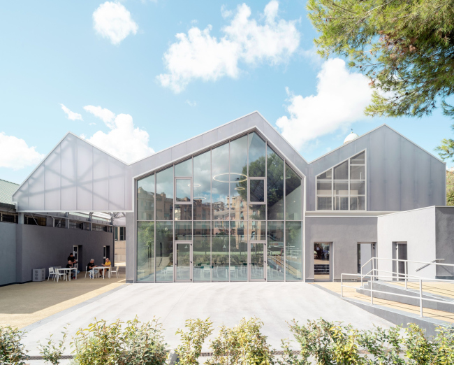Начали со сноса непригодных для дальнейшего использования ветхих строений, в которых раньше располагались библиотека с читальным залом, бар и другие объекты, что позволило реорганизовать весь участок. Затем реконструировали четыре вытянутых объема на бетонном фундаменте с характерными двускатными кровлями. Чтобы дополнительно подчеркнуть промышленное прошлое района и сохранить его идентичность, к имеющимся объемам добавили еще два, тоже с двускатной кровлей. Одновременно был сформирован проход через территорию, чтобы вытянутый участок не разрезал квартал на две части.