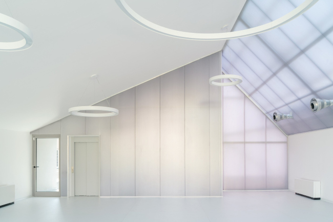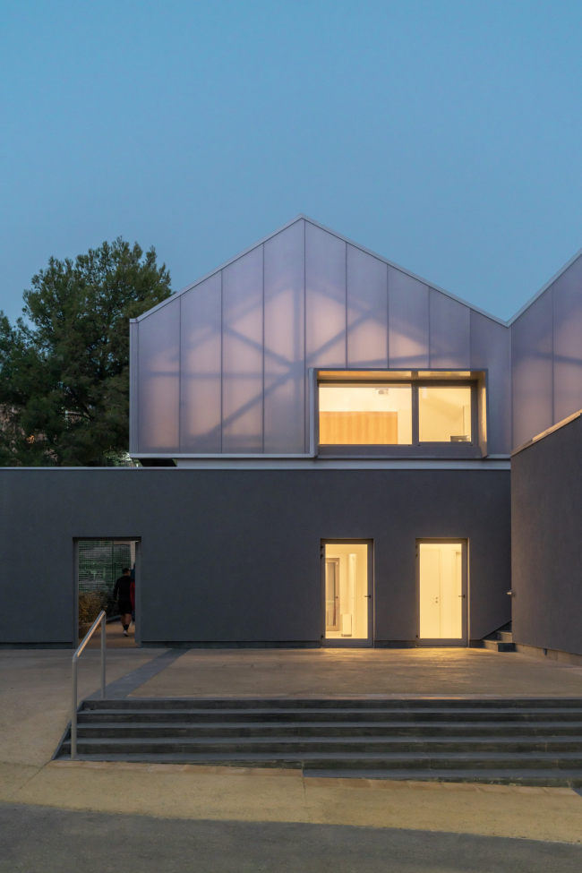 Помещения общественного центра расположены на двух этажах. Первый выполнен из монолитного бетона, а второй сформирован легкой стальной конструкцией, закрытой листами поликарбоната. Матовые панели частично пропускают солнечные лучи, создавая в интерьере второго этажа эффектное рассеянное освещение и необычную атмосферу.