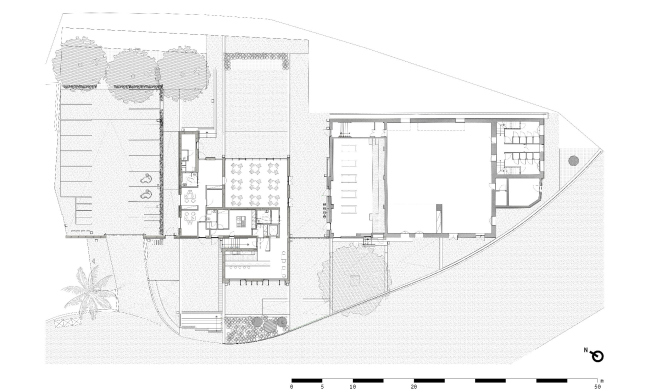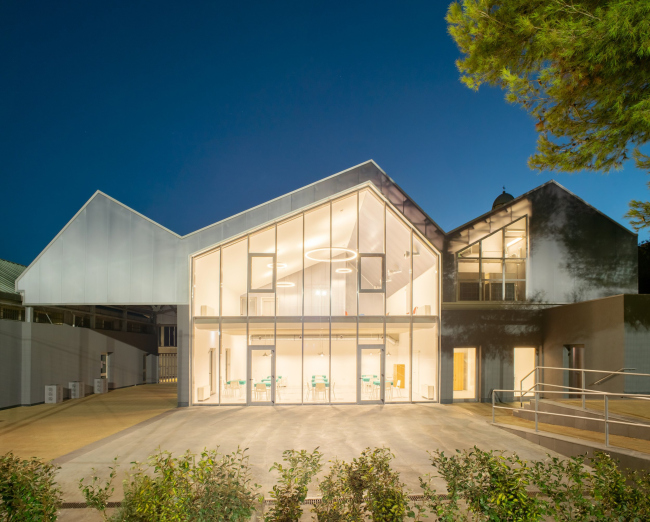 Большое внимание уделили и открытым зонам. Во-первых, на крыше части новой бетонной конструкции устроена летняя терраса, во-вторых, такой же навес из поликарбоната соединяет новую и реконструированную части центра, формируя уютное и защищенное пространство. В-третьих, пешеходная часть территории приподнята и отделена от парковки и проездов кустами и цветочницами. В-четвертых, в задней части участка организована зона, куда помещения центра выходят сплошным остеклением: здесь летом можно устраивать танцы. Наконец, растущие на территории большой платан и дерево гинкго также создают вокруг себя затененные места для отдыха и общения.Общественный центр района Корнильяно в Генуе© Dodi Moss & SAB / предоставлено агентством Cultivar