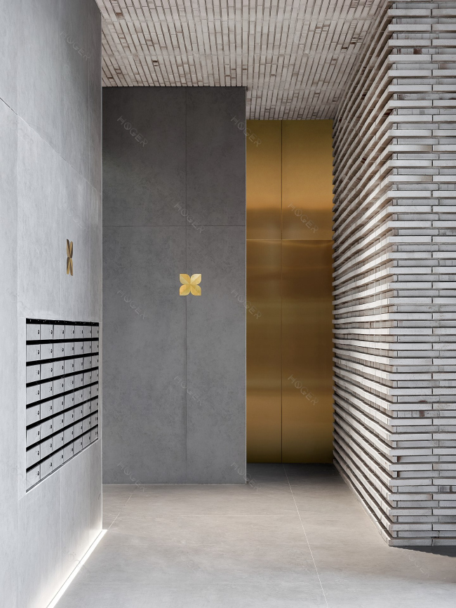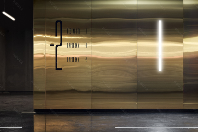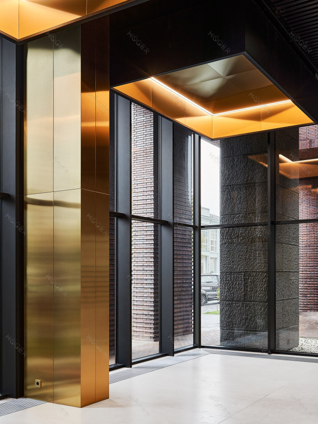 ЖК Садовые Кварталы. Облицовка стендовыми панелями из стали с PVD покрытием Satin Gold. HÖGER©