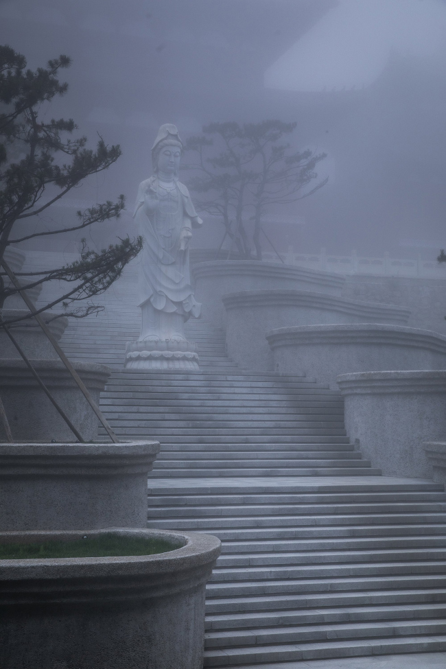 Перепад высот в целых 10 метров позволил создать эффектную террасную лестницу, посередине которой расположена статуя милосердной бодхисаттвы Гуаньинь. Семиуровневая конструкция полностью симметрична относительно центральной оси, но все ее ярусы имеют разную высоту. При этом скругленные формы придают ей сходство с облаками. Особенно эффектно «облачная терраса» смотрится во время сильных туманов, характерных для этой гористой местности. Возникает особая переходная зона, помогающая посетителю подготовится к дальнейшим переживаниям. В качестве визуального прототипа архитекторы использовали в том числе храмовый комплекс Боробудур на острове Ява.