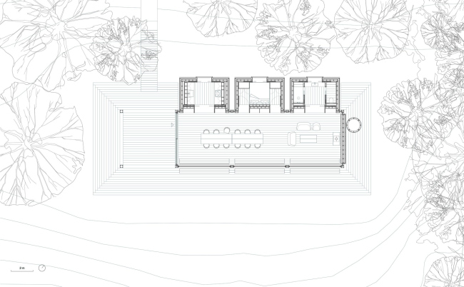 Но главную роль все же играет большая столовая с зоной отдыха у камина: здесь удобнее, чем в коттедже, принимать гостей, причем угостить их можно не только обедом, но и роскошным видом на залив и на ярко-зеленое соленое болото (salt marsh) на границе моря и суши. Панорамное остекление в теплую погоду можно вообще убрать: стекла с помощью мотора погружаются под землю. Снаружи устроена еще одна большая терраса, которую от солнца и дождя защищает вынос кровли.