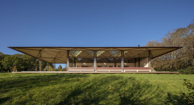 Это сооружение площадью чуть более 100 м2 дополнило большой коттедж викторианской эпохи, главную постройку участка на берегу залива Бембридж. Оно заняло место старинных теплиц с пирамидальной кровлей, поэтому такой силуэт Níall McLaughlin Architects выбрали и для своего проекта. Четырехчастная медная крыша свидетельствует о внутреннем устройстве «флигеля»: в нем три функциональных блока (обшитые медью спальня, ванная и кухня) и просторная терраса.