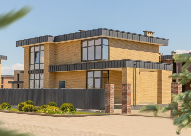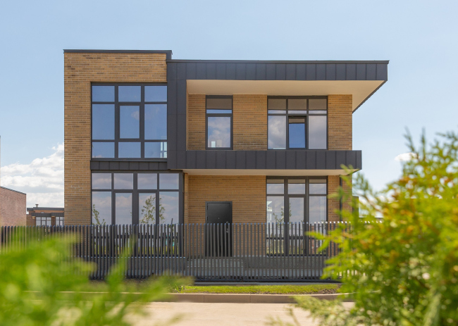 В поисках подходящего кирпича для фасадов в условиях импортозамещения остановились на местном отечественном производителе, продукция которого – лицевой кирпич – соответствует как стандартам качества, так и запросам на разные цветовые решения, заложенные в проекте, и ни в чем не уступает голландцам и немцам. Всего было использовано четыре базовых цвета кирпича в различных оттенках – от песочно-серого до темно-коричневого, а также три цвета для заполнения швов – черный, белый и серый, что позволило создавать комбинации и разнообразить застройку в целом, а также предоставить покупателю возможность выбора готового дома в предпочтительном ему цвете.
