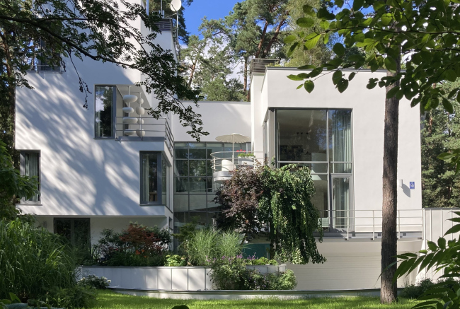 Дом имеет U-образный план и обращен на юг. Его компактная объемная композиция имеет четыре уровня, она, как и положено, четко следует за функцией. В северной, обращенной к морю части, друг над другом размещены бассейн, библиотека и кухня, а в высоком юго-западном крыле устроены спальни. Юго-восточный объем ниже, его занимает двухуровневая гостиная зона с камином. Основным же организующим элементом всего дома служит специальный пандус, связывающий все основные зоны. Балконы, террасы и озеленение на крыше также укладываются в рамки исходной модернистской концепции. А завершает композицию высокая смотровая башня, позволяющая хозяевам и их гостям подняться над соснами и любоваться морскими видами. Оформлением интерьеров занималась сама Гуна Эглите, в них подчеркивающие объем и расширяющие пространство белые поверхности сочетаются с лаконичными деталями из натурального дерева теплого золотистого оттенка.