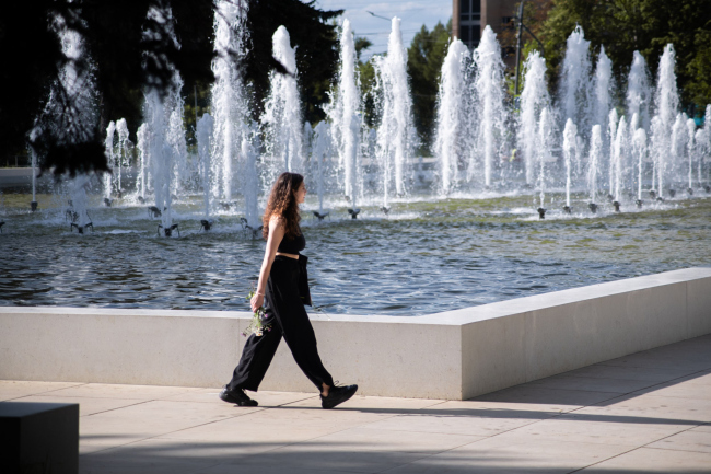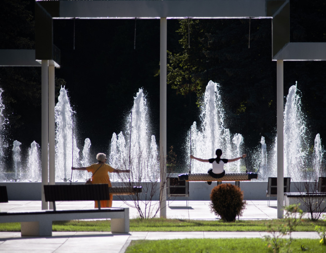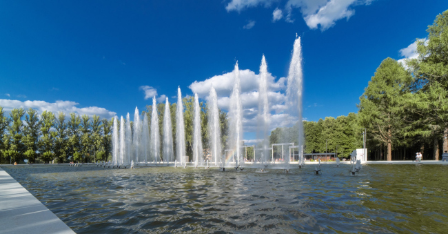 Зеркало фонтана осталось прежним – 30х80 м: это был очень важный момент, который влиял на финансовую сторону вопроса как в реализации, так и в дальнейшей эксплуатации, и за который потом бились архитекторы «Маякворкшоп» уже на стадии рабочего проектирования. Вдобавок к самому большому в Московской области зеркалу добавили игру воды – 85 струй с подсветкой и меняющимися режимами работы. Теперь именно они, а не гладь воды, которая была подчеркнута раньше невысокими плоскими бортами, стали главной «фишкой» места. Облицовка фонтана выполнена из архитектурного бетона, который в какой-то степени воспроизводит прежнее модернистское покрытие фонтана, хотя бортики его стали уже и выше.