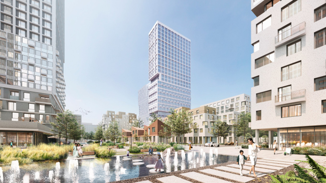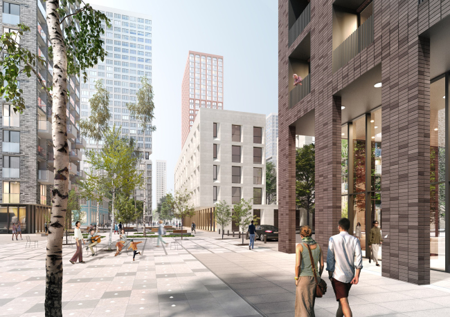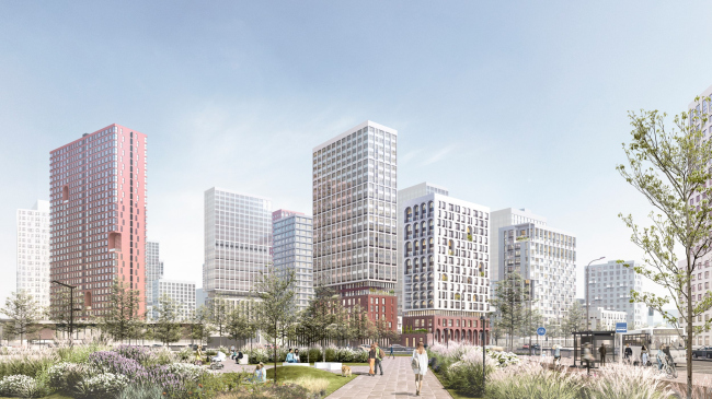Опираясь на каркас улиц, в качестве базы архитекторы создают жилые группы с секциями в 5-9 этажей. Всего таких групп-кварталов 16, их концентрация и плотность увеличивается в сторону транспортной развязки. Иногда высота снижается до уровня галереи стилобата, открывая виды на дворы, башни или бульвар. При этом все, что превышает показатель среднеэтажной застройки, архитекторы отделяют пластически и уводят в относительную невесомость и фоновую прозрачность.