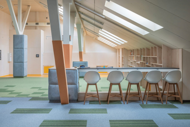 Школа «Вектор» уже открылась, и помещение под мансардой стало одним из самых любимых у учеников школы. Это не удивительно – обширное пространство хорошо освещено, а через окна можно смотреть на небо и наблюдать за движением облаков на переменах и вне уроков.