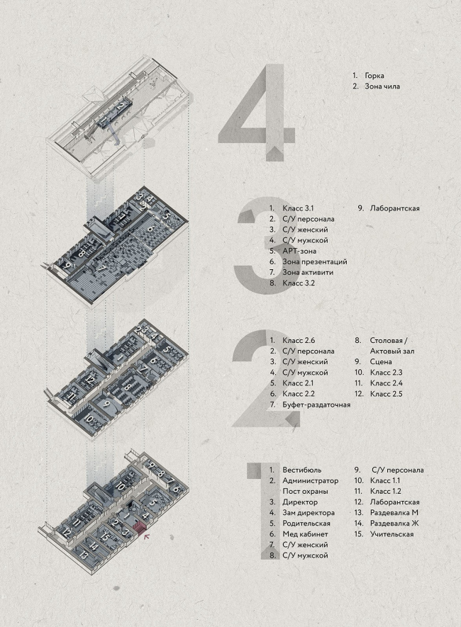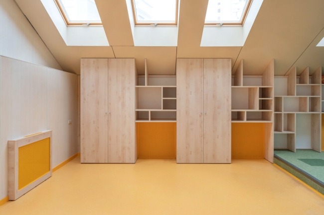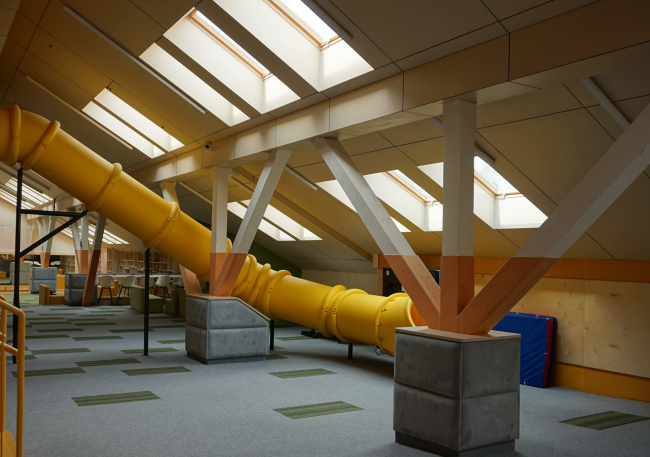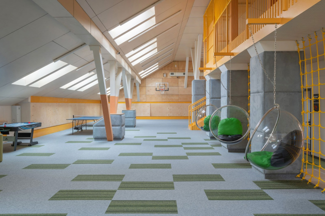 На трех этажах здания разместились 10 учебных классов, просторная комната для родителей, учительская, раздевалки, санузлы, большая рекреация с антресолью и гибридное пространство с функциями столовой и актового зала. Мансардный этаж было необходимо приспособить под нужды школы – здесь решили разместить рекреационные пространства для отдыха. Одной из проблем стало обеспечение этой зоны естественным светом.