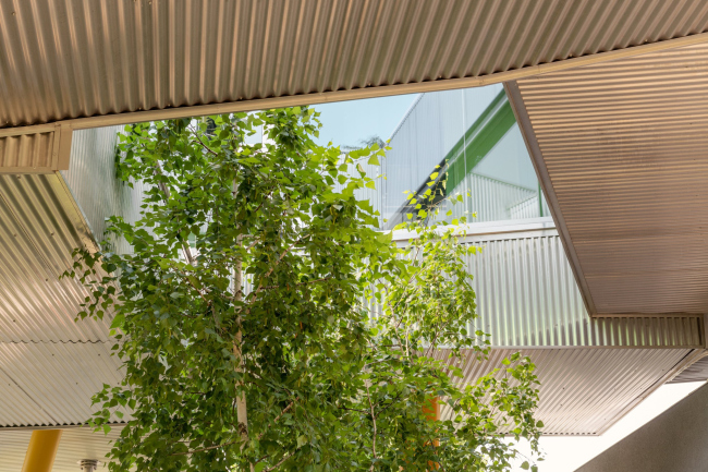 Кровлю старого, почти квадратного здания разобрали и вместо нее создали открытую террасу, засаженную зеленью. Внутри обустроены гараж, подсобные помещения и часть жилых комнат. А основные площади (кухню, спальни, гостиную и т. д.) разместили в нескольких отдельных «контейнерах», поднятых на Y-образные ярко-желтые опоры из металла. Попасть внутрь можно по подвесным металлическим лестницам. Схожесть с грузовыми контейнерами обеспечивает отделка фасадов из алюминиевых панелей. За энергоэффективность всей конструкции отвечают слой теплоизоляции из пенополиуретана, нанесенный при помощи напыления, и солнечные батареи на крыше.