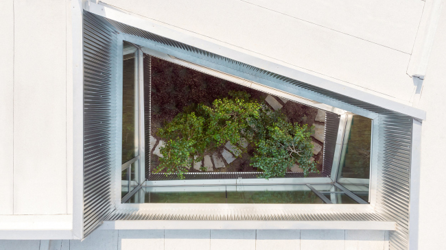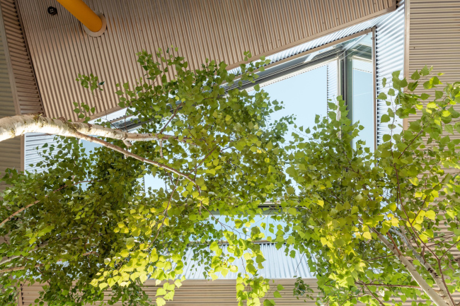 Каждый из «контейнеров», размещенных на разной высоте вокруг центрального внутреннего «двора», вмещает одну из жилых зон, которые оказываются объединены общим маршрутом. Перемещение по дому таким образом превращается в своеобразное путешествие по кронам деревьев – расслабленное и комфортное, но головокружение вполне может возникнуть. Остекление связывает интерьеры с окружением, открывая прекрасные виды на Альпы. Внутри очень много света – все благодаря этой центральной «дыре». А для отделки архитекторы выбрали различные оттенки зеленого, продолжив таким образом тему листвы в интерьерах.